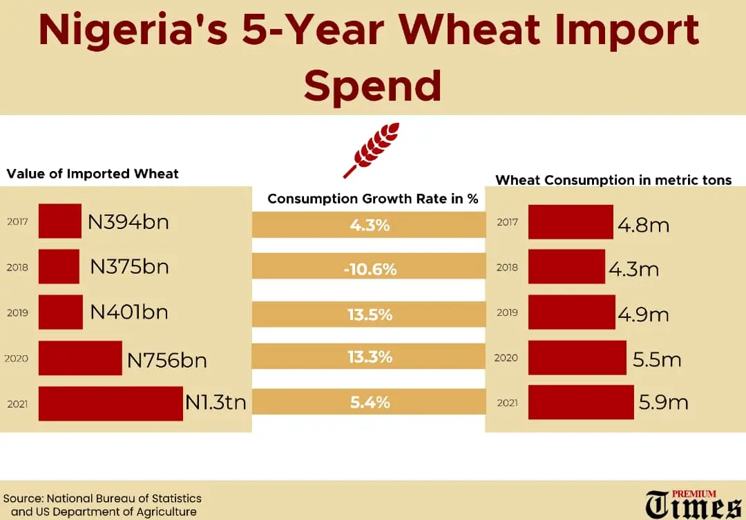 As meagre as 1 per cent of the 4.7 million tons of the wheat projected by the U.S. Department of Agriculture to be consumed by Africa’s most populous nation this year would be produced at home, leaving the humongous balance at the mercy of importation.