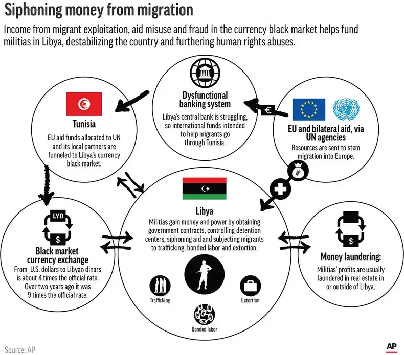 Beyond the direct abuse of migrants, the militia network also profits by siphoning off money from EU funds sent for their food and security -- even those earmarked for a U.N.-run migrant center, according to more than a dozen officials and aid workers in Libya and Tunisia, as well as internal U.N. emails and meeting minutes seen by The Associated Press.